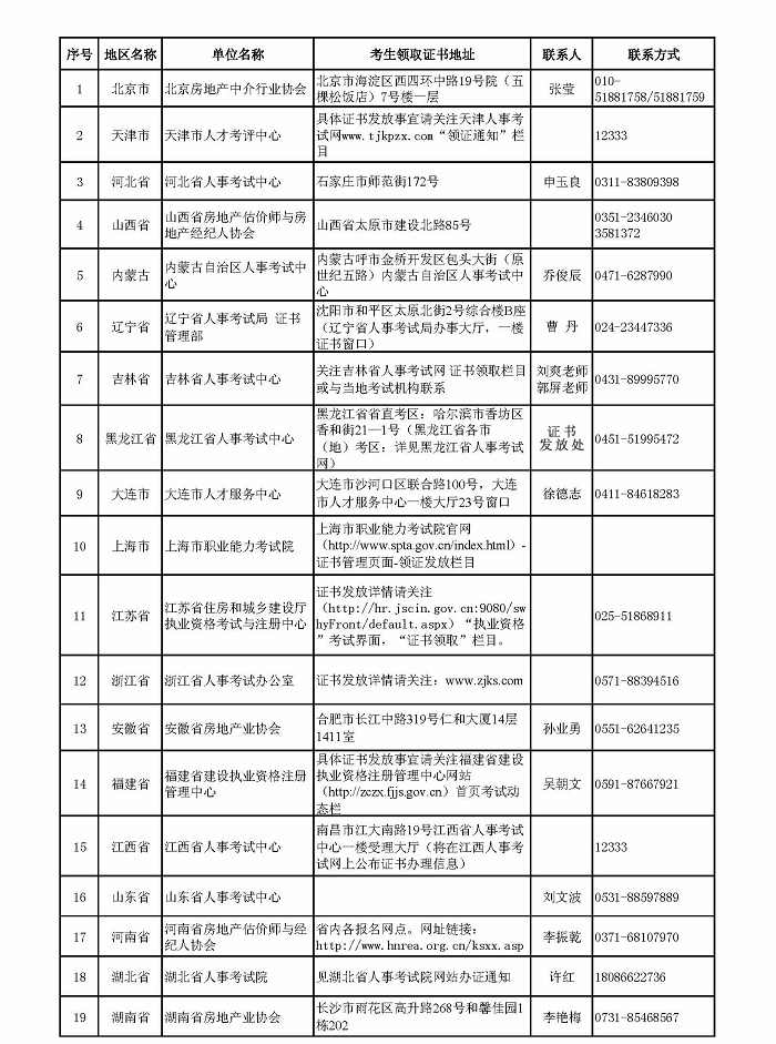 根据人力资源社会保障部、住房城乡建设部《关于印发<房地产经纪专业人员职业资格制度暂行规定>和<房地产经纪专业人员职业资格考试实施办法>的通知》(人社部发〔2015〕47号)规定,自2015年起参加全国房地产经纪人职业资格考试成绩合格者,由我会统一颁发《中华人民共和国房地产经纪专业人员职业资格证书》(以下简称房地产经纪专业人员职业资格证书),该证书在全国范围有效。为保证证书发放工作的顺利进行,现就有关事项通知如下: