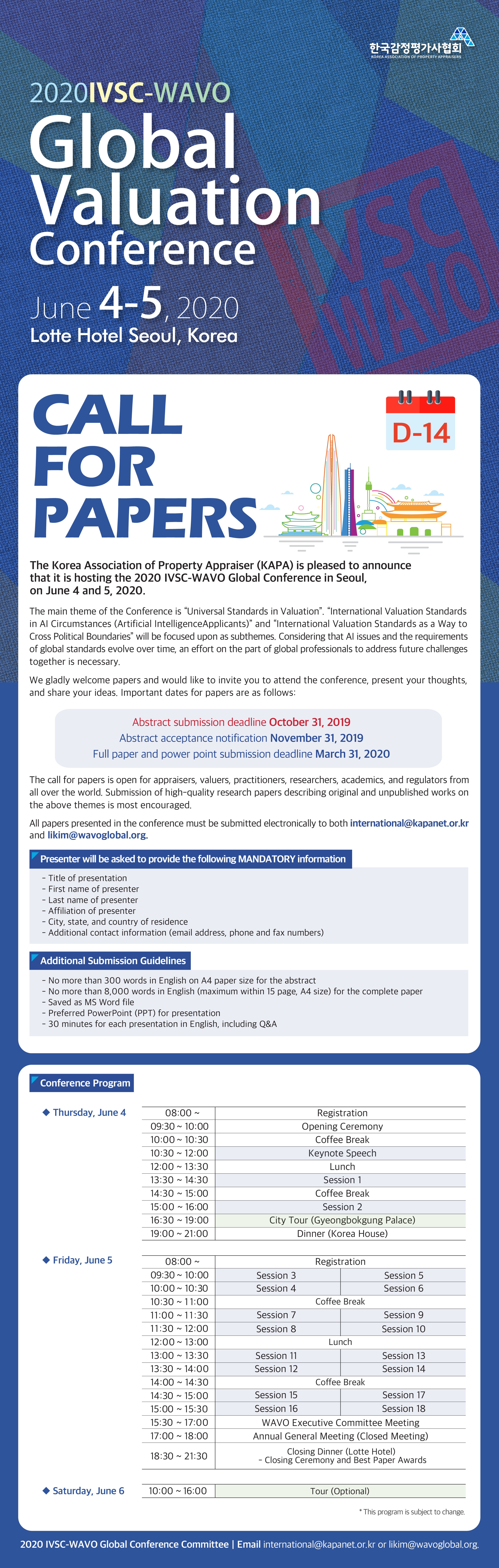 由国际估价标准委员会(英文全称International Valuation Standards Council,简称IVSC)和世界估价组织协会(英文全称World Association of Valuation Organizations,简称WAVO)联合举办的2020年全球估价会议将于2020年6月4日至5日在韩国首尔(Seoul, Korea)举行。