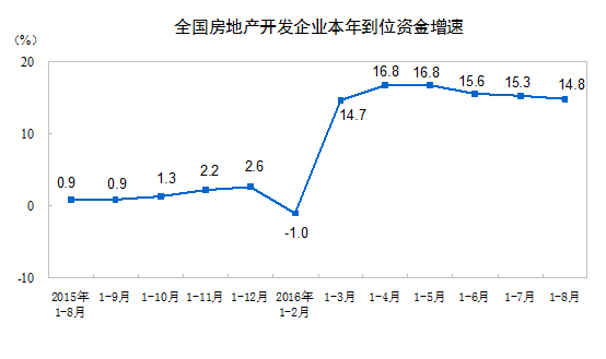 1-8月份,房地产开发企业到位资金91573亿元,同比增长14.8%,增速比1-7月份回落0.5个百分点。其中,国内贷款14199亿元,增长1.7%;利用外资97亿元,下降52.6%;自筹资金31983亿元,增长0.6%;其他资金45294亿元,增长34.1%。在其他资金中,定金及预收款25656亿元,增长29.7%;个人按揭贷款15395亿元,增长52.2%。