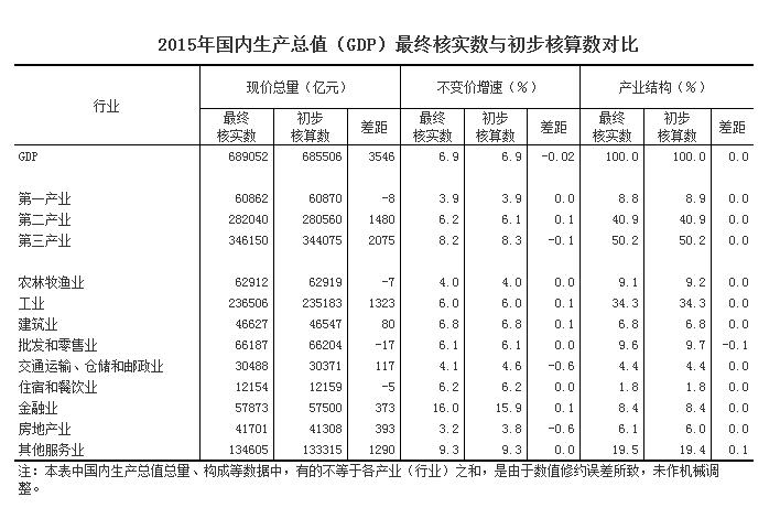 经最终核实,2015年,GDP现价总量为689052亿元,比初步核算数增加了3546亿元;按不变价格计算,比上年增长6.9%,与初步核算数一致。三次产业和各行业数据见附表。