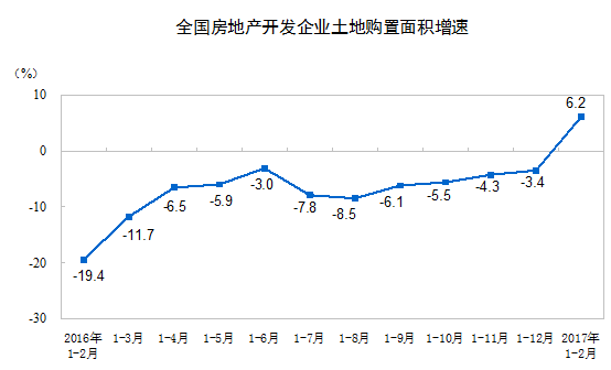 1-2月份,房地产开发企业土地购置面积2374万平方米,同比增长6.2%,去年全年为下降3.4%;土地成交价款794亿元,增长12.7%,增速回落7.1个百分点。