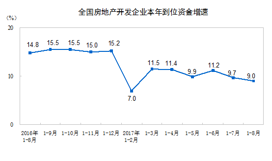 1-8月份,房地产开发企业到位资金99804亿元,同比增长9.0%,增速比1-7月份回落0.7个百分点。其中,国内贷款16904亿元,增长19.0%;利用外资112亿元,增长15.4%;自筹资金31439亿元,下降1.7%;其他资金51349亿元,增长13.4%。在其他资金中,定金及预收款30786亿元,增长20.0%;个人按揭贷款15764亿元,增长2.4%