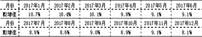 注2:2018年1月,人民银行完善货币供应量中货币市场基金部分的统计方法,用非存款机构部门持有的货币市场基金取代货币市场基金存款(含存单)。完善后,2017年各月末M2增速如下: