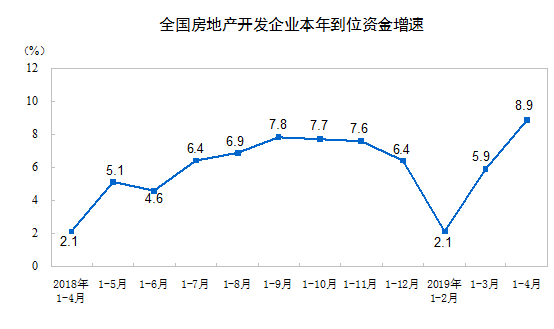 14月份,房地产开发企业到位资金52466亿元,同比增长8.9%,增速比13月份提高3个百分点。其中,国内贷款8955亿元,增长3.7%;利用外资34亿元,增长1.0倍;自筹资金15687亿元,增长5.3%;定金及预收款17249亿元,增长15.1%;个人按揭贷款8031亿元,增长12.4%