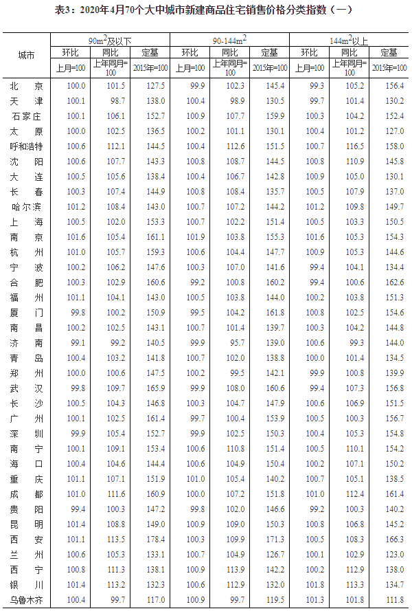 2020年4月份70个大中城市商品住宅销售价格变动情况