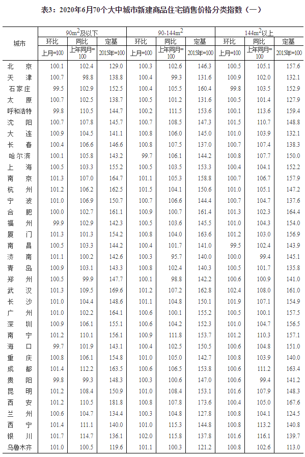 2020年6月份70个大中城市商品住宅销售价格变动情况